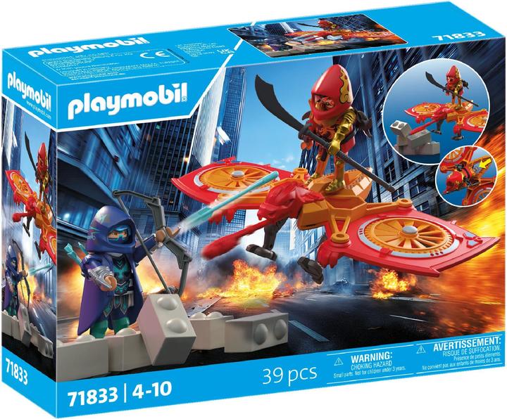 PLAYMOBIL Heroes: Red Dragon vs. Shadow Raven – Ninja Drone Battle. An intense fight breaks out between the rival ninjas! Red Dragon attacks with his movable dragon drone, whose rotating wings ensure dynamic operations. The integrated cannon, which fires projectiles at the push of a button, adds extra excitement. While Shadow Raven defends himself with a bow, arrows, and a shuriken behind a destructible wall, Red Dragon relies on his powerful Chinese broadsword in close combat to fight for his clan. This set offers thrilling ninja action!.