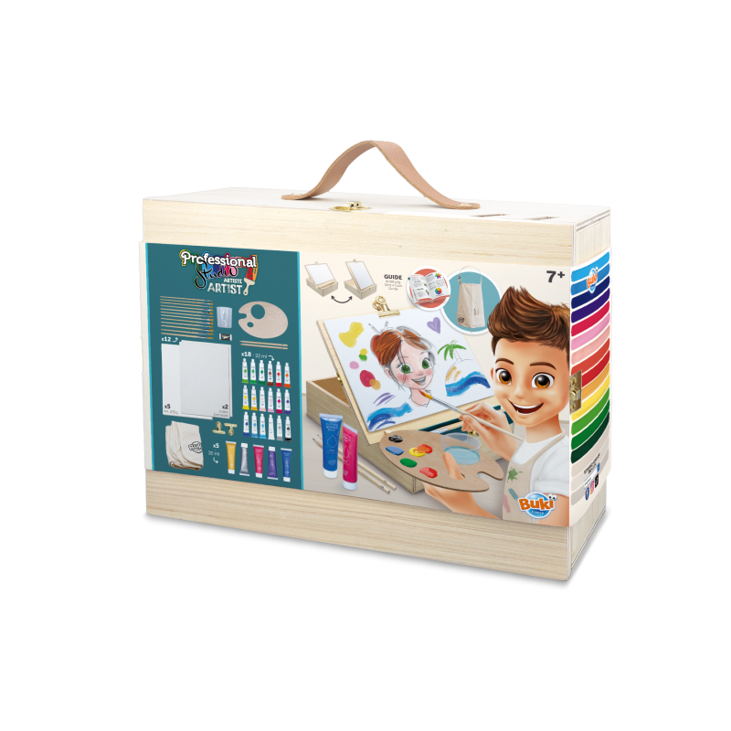 Accessories included: 1 artist’s apron, 2 thin canvases A4 format, 5 sheets of 230 g A4 paper, 2 metal clips to hold them in place, 12 paint brushes of different shapes and sizes, 1 eraser, 1 HB pencil, 1 2B pencil, 1 wooden palette with cup, 18 tubes containing 22 ml of acrylic paint and 5 tubes containing 20 ml of glitter paint.